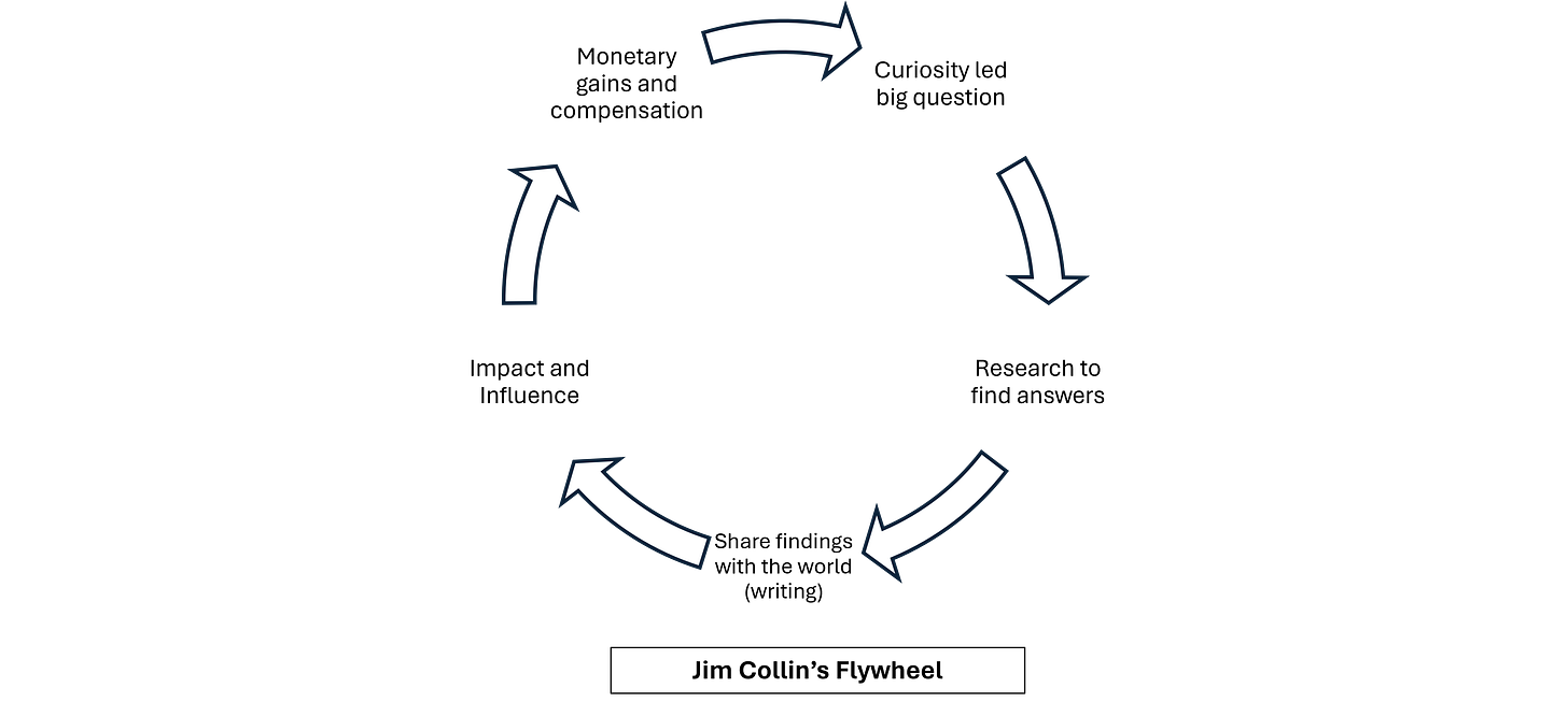 The Flywheel effect - It is pretty similar to a virtuous cycle wherein one step leads to a positive change, leading to the following positive change and increasing the momentum, which in turn leads to a significant change or impact. For, e.g.) Jim's flywheel looks something like this - It starts with curiosity-led big questions. He researches to get answers to those questions. Those answers help him learn something new. When he learns those things, he shares them with others in the form of writing, which impacts the world, giving him funding and monetary gains, which in turn propels him to look for the next big questions.